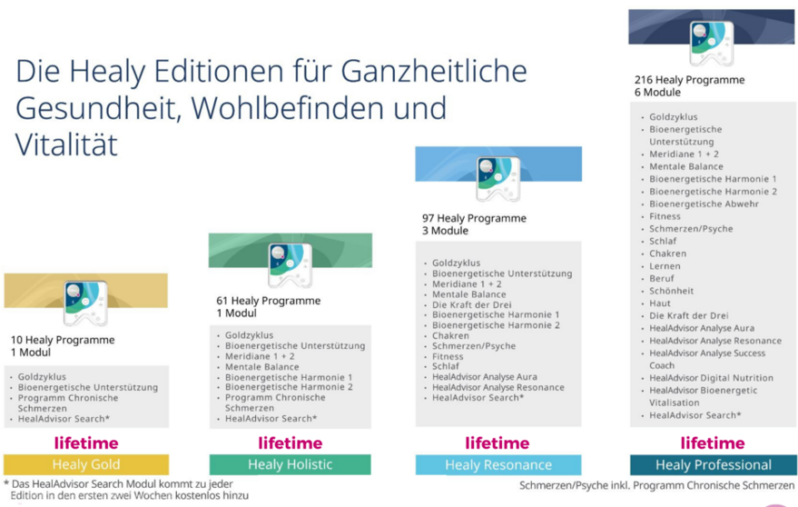 Wenn Du ein Unternehmen hast, therapeutisch arbeitest und den Healy in der Praxis einsetzen möchtest, dann wird für Dich –> langfristig <– der Healy Professional die sinnvolle Wahl sein. Hier investierst Du etwas mehr. Dafür bekommst Du 216 Healy Programme und 6 Module.