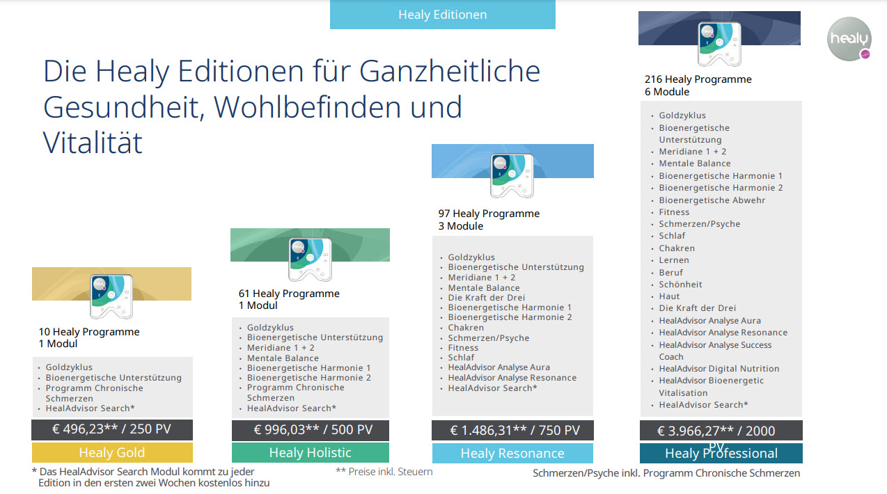 Healy ist eine geniale Erfindung die dir Unterstützung für deine Gesundheit, deinen Körper, dein Wohlbefinden, deine Familie bieten soll und trotzdem ganz einfach zu anzuwenden ist. Damit du immer den Überblick hast, was der Healy für dich tun kann, und damit du nur das kaufst, was du wirklich brauchst, haben wir die Programmgruppen und Module des Healy in verschiedenen Editionen zusammengefasst, aus denen du dir die beste aussuchen kannst.