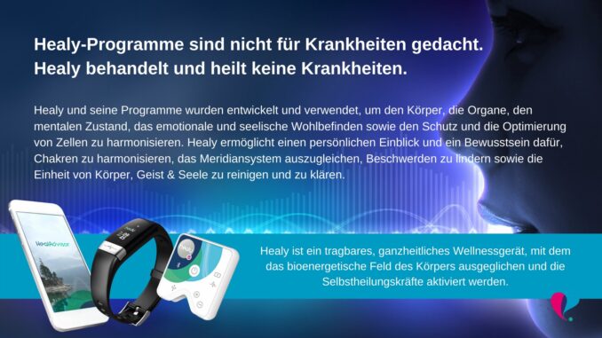 Er kann aufgrund seiner Größe überall mit hingenommen werden und bietet durch die spezifischen Frequenzen diese Unterstützung auch unterwegs, egal wo man sich befindet. Healy GesundheitEs ein zertifiziertes “Wearable”, das mithilfe individuell ermittelter Frequenzen bestimmte Bereiche in deinem Körper stimulieren soll. Durch regelmäßige Anwendung der ausgewählten Frequenzprogramme soll der Healy dabei unterstützen, dass die Zellmembranspannung wieder auf ein natürliches Niveau gebracht wird. Um dies zu erreichen, gibt es für viele Lebensbereiche Frequenzprogramme, um Gesundheit, Wohlbefinden und Balance zu fördern. Der Healy bietet für alle Bereiche im Leben Programme an, sodass du ganz gezielt auf deine individuellen Beschwerden eingehen und du dir selber helfen kannst.